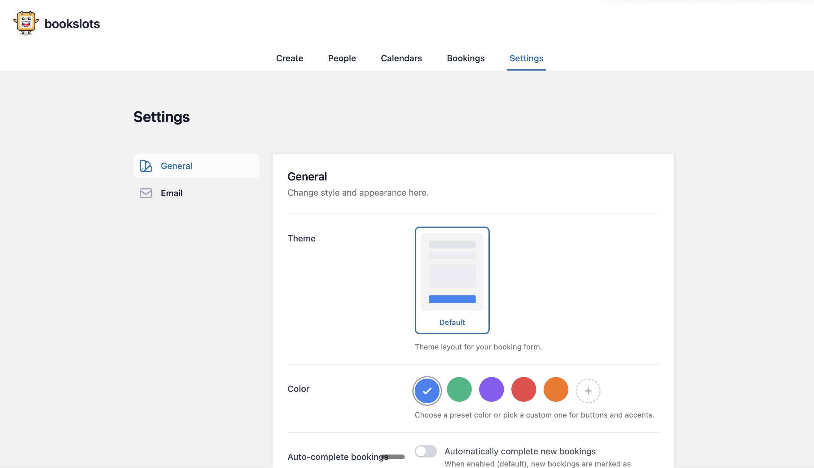 Settings Page – Customize theme, colors, and booking options