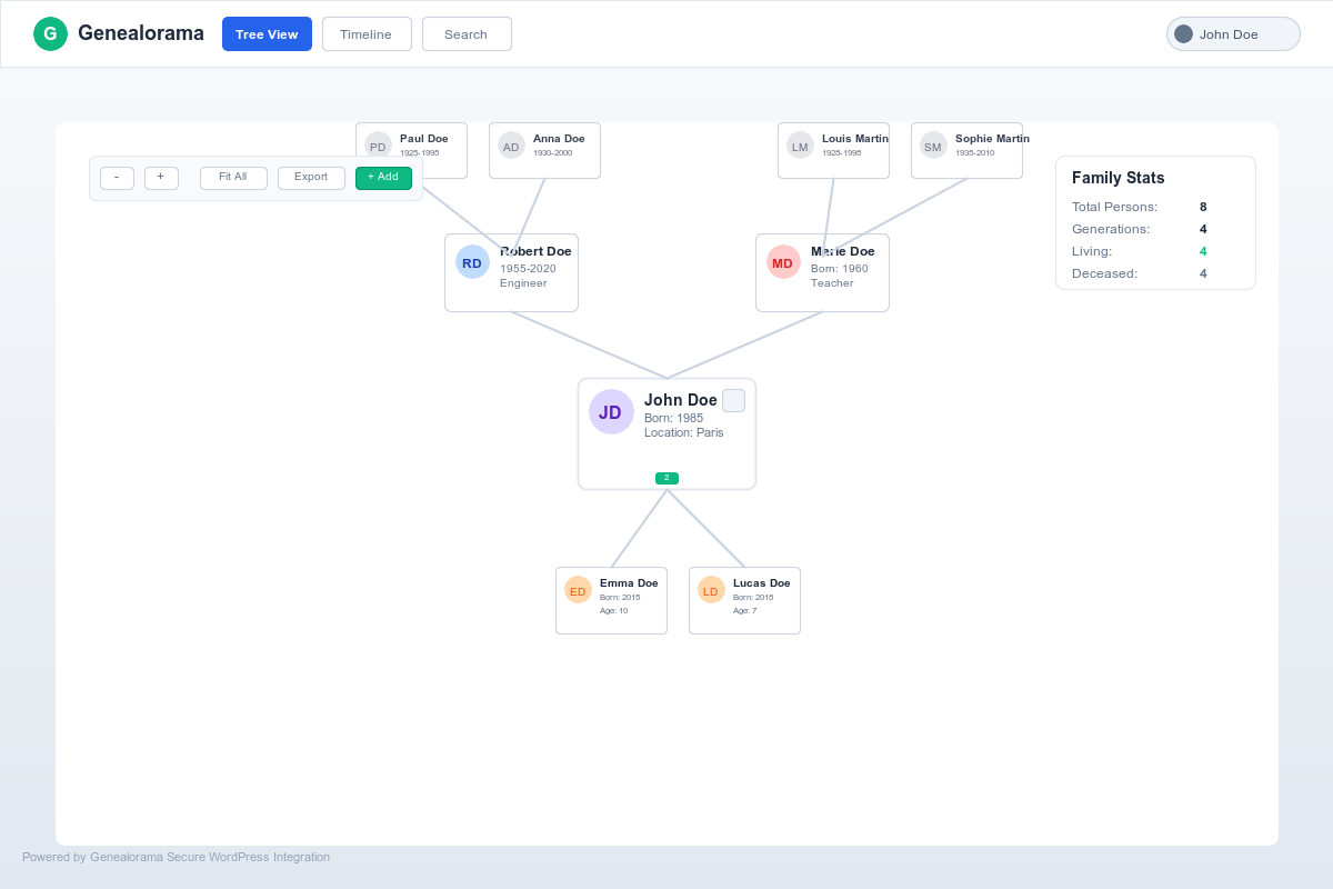 The plugin provides a secure, authenticated gateway to the Genealorama genealogy platform, allowing your logged-in users to explore interactive family trees, discover ancestral connections, and engage with genealogical data in an immersive, full-screen environment.