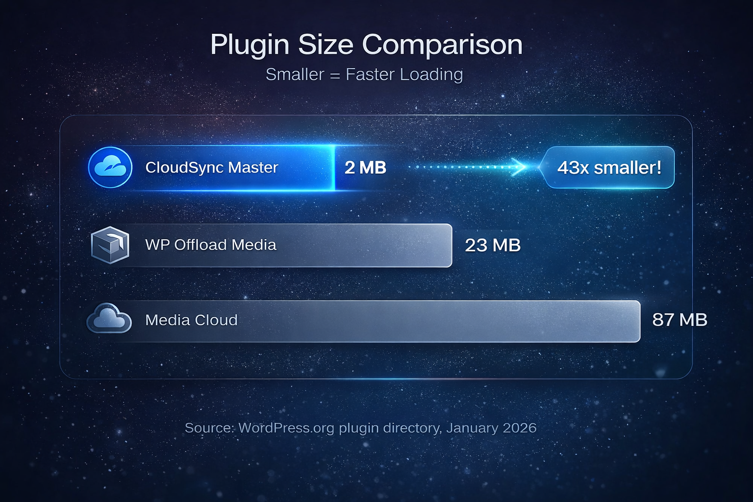 - Plugin Size – CloudSync Master: <1.5 MB, WP Offload Media: 23 MB, Media Cloud: 87 MB